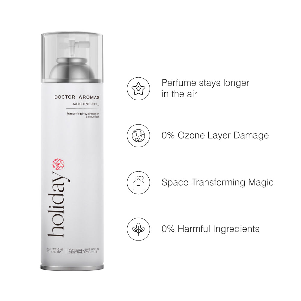 Tall white aerosol can labeled "Holiday" with clear plastic cap and modern minimalist design. - A/C Scenting System | Holiday - Holiday - Doctor Aromas