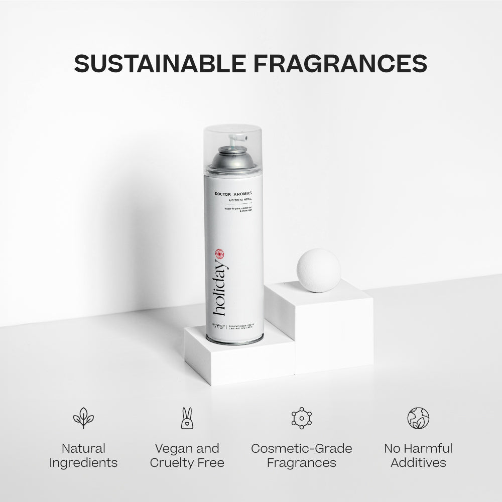 Tall silver aerosol can with white label reading Holiday, placed next to a white cube and sphere on a white surface. - A/C Scenting System | Holiday - Holiday - Doctor Aromas