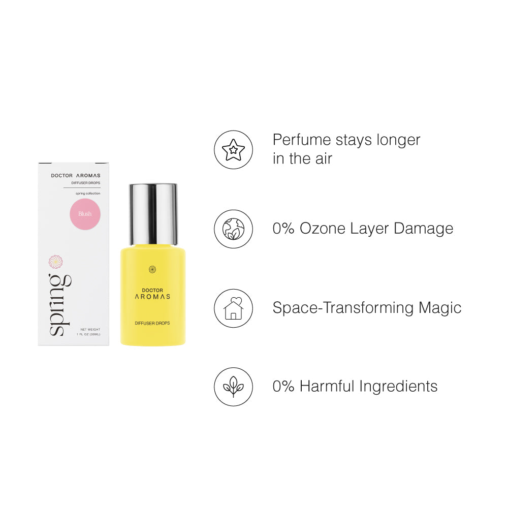 Yellow glass aromatherapy bottle with silver cap next to white box with blush accent and black text. - Aromatherapy Stone Diffuser | Blush - Blush / White - Doctor Aromas