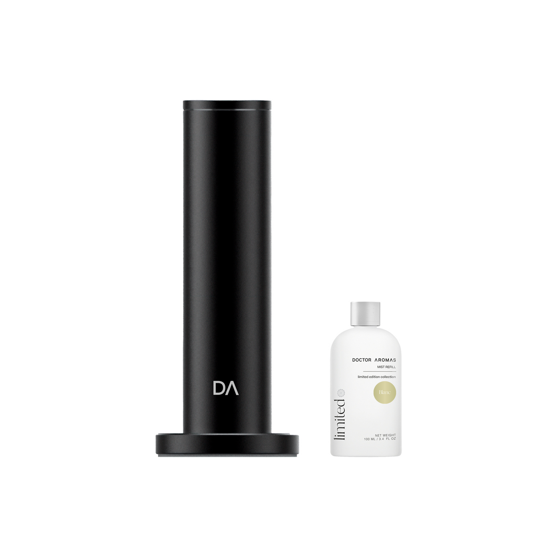 Matte black cylindrical aroma diffuser with subtle logo on front, placed on white countertop near white bottle. - Aroma Diffuser 500 | Hope - Hope / Black - Doctor Aromas