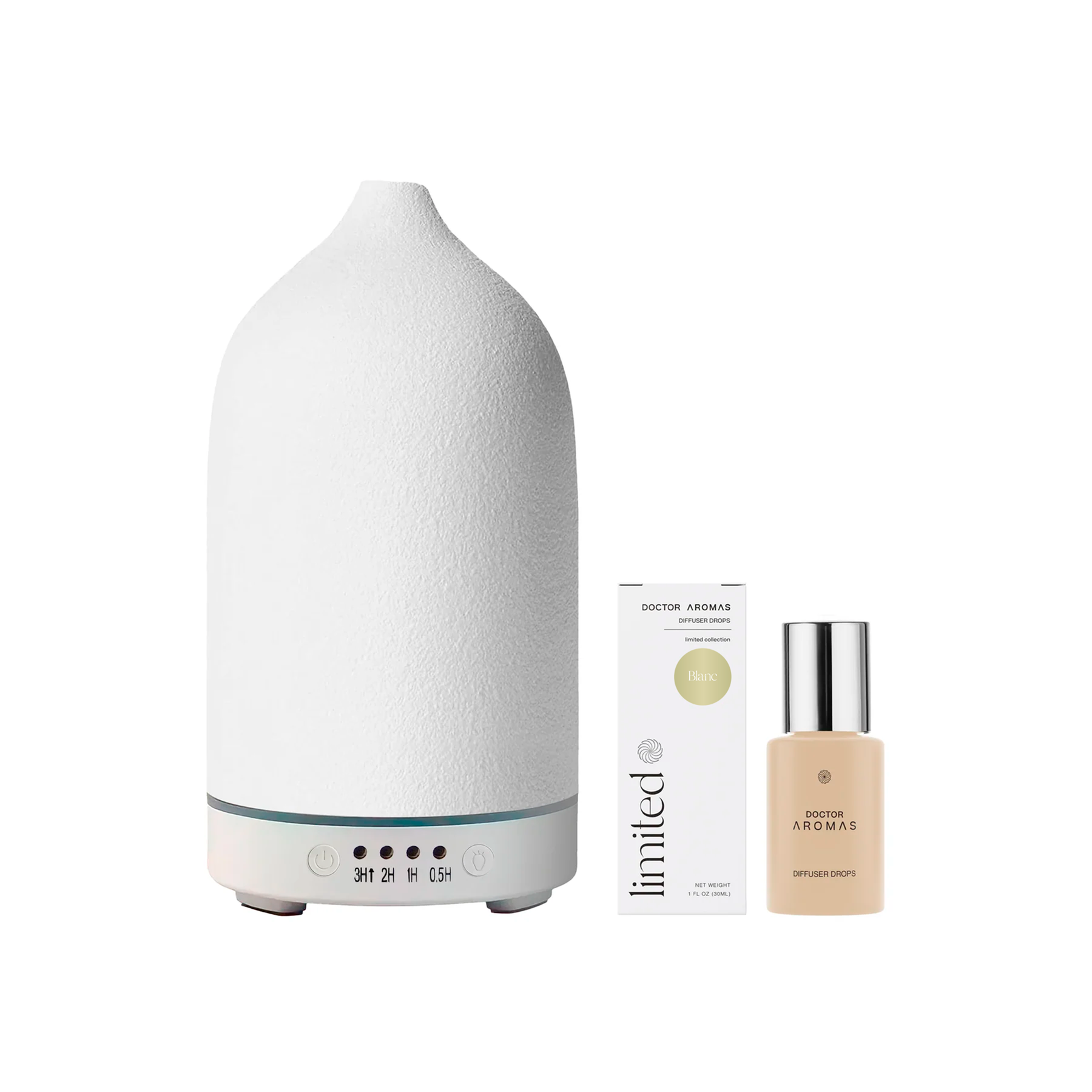 White matte stone aromatherapy diffuser with teardrop shape on bathroom countertop next to essential oil bottle and woven. - Aromatherapy Stone Diffuser | Hope - Hope / White - Doctor Aromas